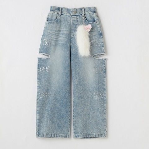 キラキラのラインストーンで描かれたキティちゃんのリボンがかわいいデニムロングパンツです。