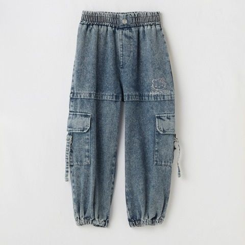 キラキラのラインストーンで描かれたキティちゃんがかわいいデニムロングカーゴパンツです。