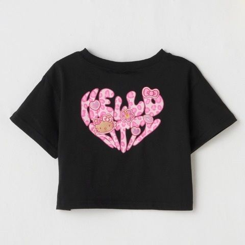 後身の日焼けキティのししゅうとヒョウ柄ロゴのプリントが目を引くTシャツです。