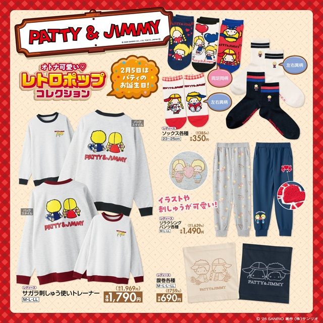 しまむら『サンリオ パティ&ジミー』コラボの新作を、2026年1月31日(土)~販売します。パティ&ジミーの誕生日をお祝いして、単品のグッズもラインナップ!