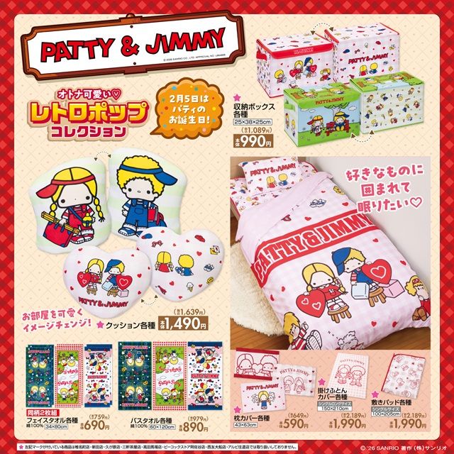 しまむら『パティ&ジミー』コラボを2026年1月31日(土)~販売します。大人可愛いレトロポップコレクションとして、アパレル、雑貨、インテリア、寝具などがラインナップ!