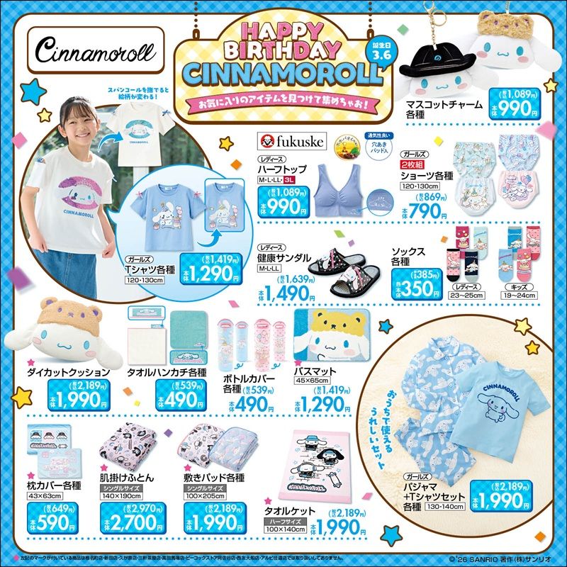 しまむらでは、2026年3月4日(水)より『シナモロール』の生誕をお祝いする、単体コラボグッズが販売します!