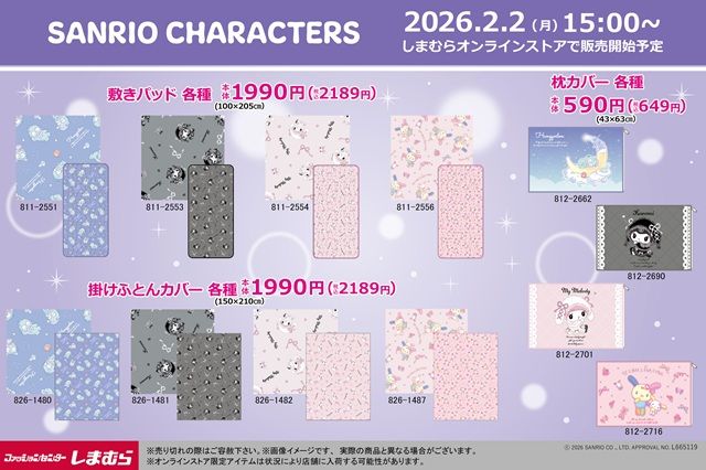 しまむら『サンリオ』コラボを2026年2月2日(月)~販売します。マイメロディ、ウィッシュミーメル、マイスウィートピアノ、あひるのペックルなどの寝具・インテリアがラインナップ!