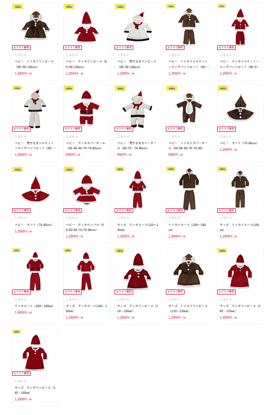 しまむらでは毎年クリスマスに向けて『サンタクロース、トナカイ』の仮装コスチュームを販売しています!ベビー、キッズのサイズがメインで展開で、価格もお手頃で人気です。