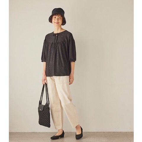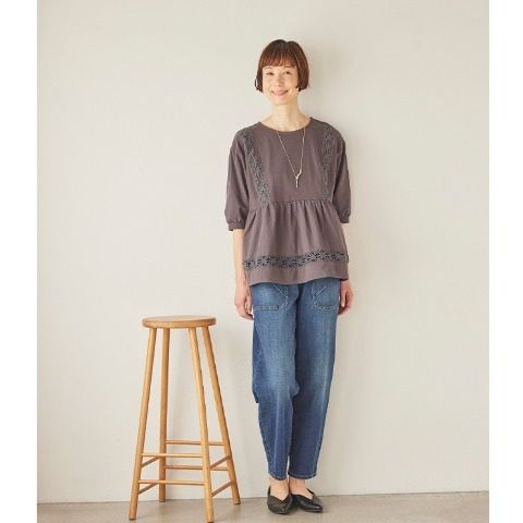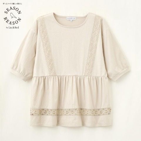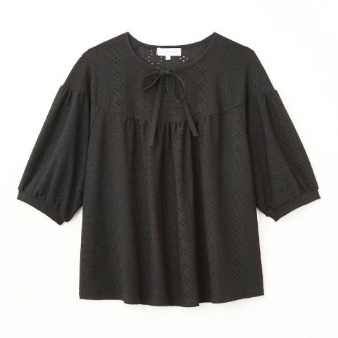 カットソーならではの伸縮性を持ちつつ、ブラウス見えするレースカットソー♪動きやすく、締め付け感のない着用感です。首元の甘すぎない細リボンが、さりげないアクセントに!