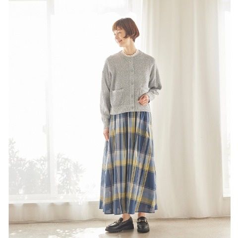 チェック柄が目をひくタックギャザースカートです。はり感のある綿混生地を使用しました。程よいボリューム感で、女性らしい着こなしが楽しめます。シンプルなトップスと合わせるだけでコーデが決まります。ウエストゴムで着脱や着心地がラク。左右ポケット付きです。