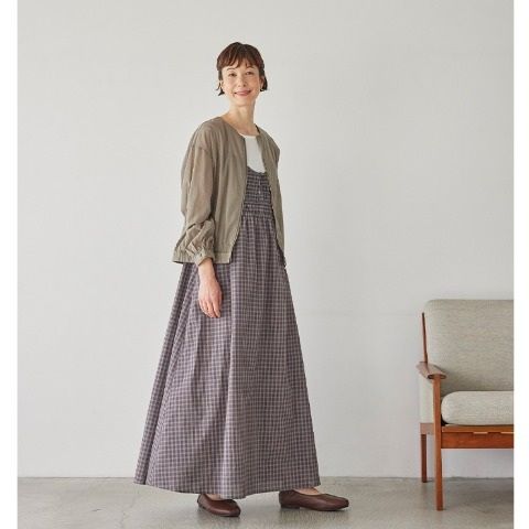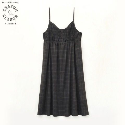 はり感のあるチェック素材を使用したキャミワンピースです。シャーリングデザインが特徴です。