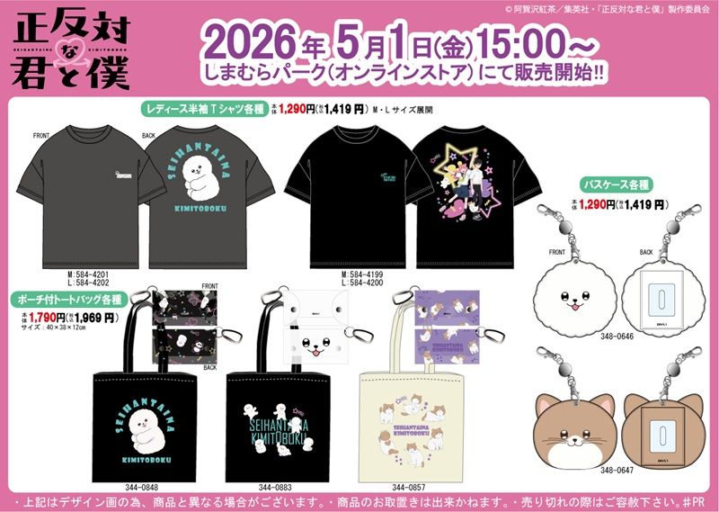 しまむら『正反対な君と僕』コラボを2026年5月1日(金)~販売します。半袖Tシャツ、ポーチ付きトートバッグ、パスケースがラインナップ!