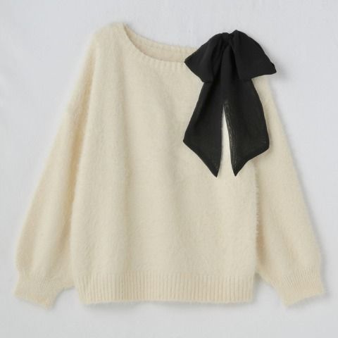 肩にあしらった大きなチュールリボンがポイントの主役級ニット。