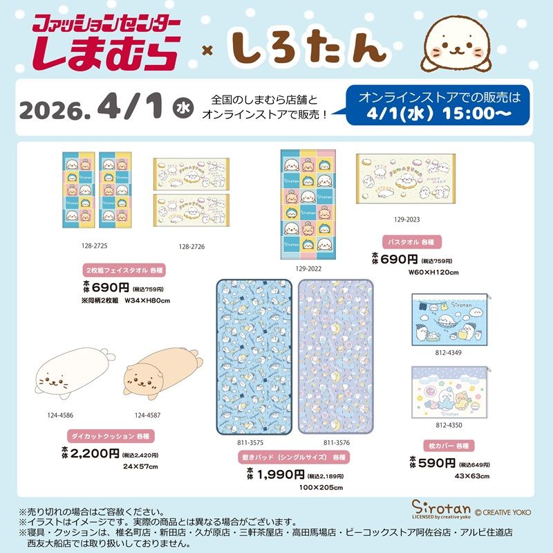しまむら『しろたん』コラボを2026年4月1日(水)~販売します。半袖Tシャツ、タオル、クッション、敷きパッド、枕カバーがラインナップ!