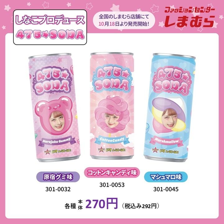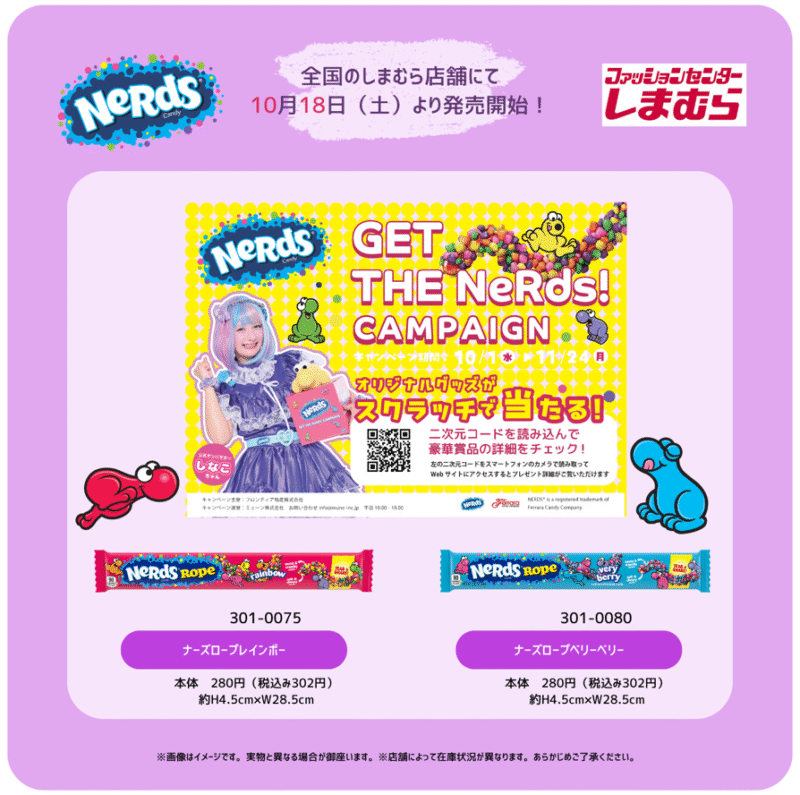 しまむら『しなこ』コラボを2025年10月18日(土)~販売します。お菓子&ジュースがラインナップ!ナーズロープ、475ソーダも!
