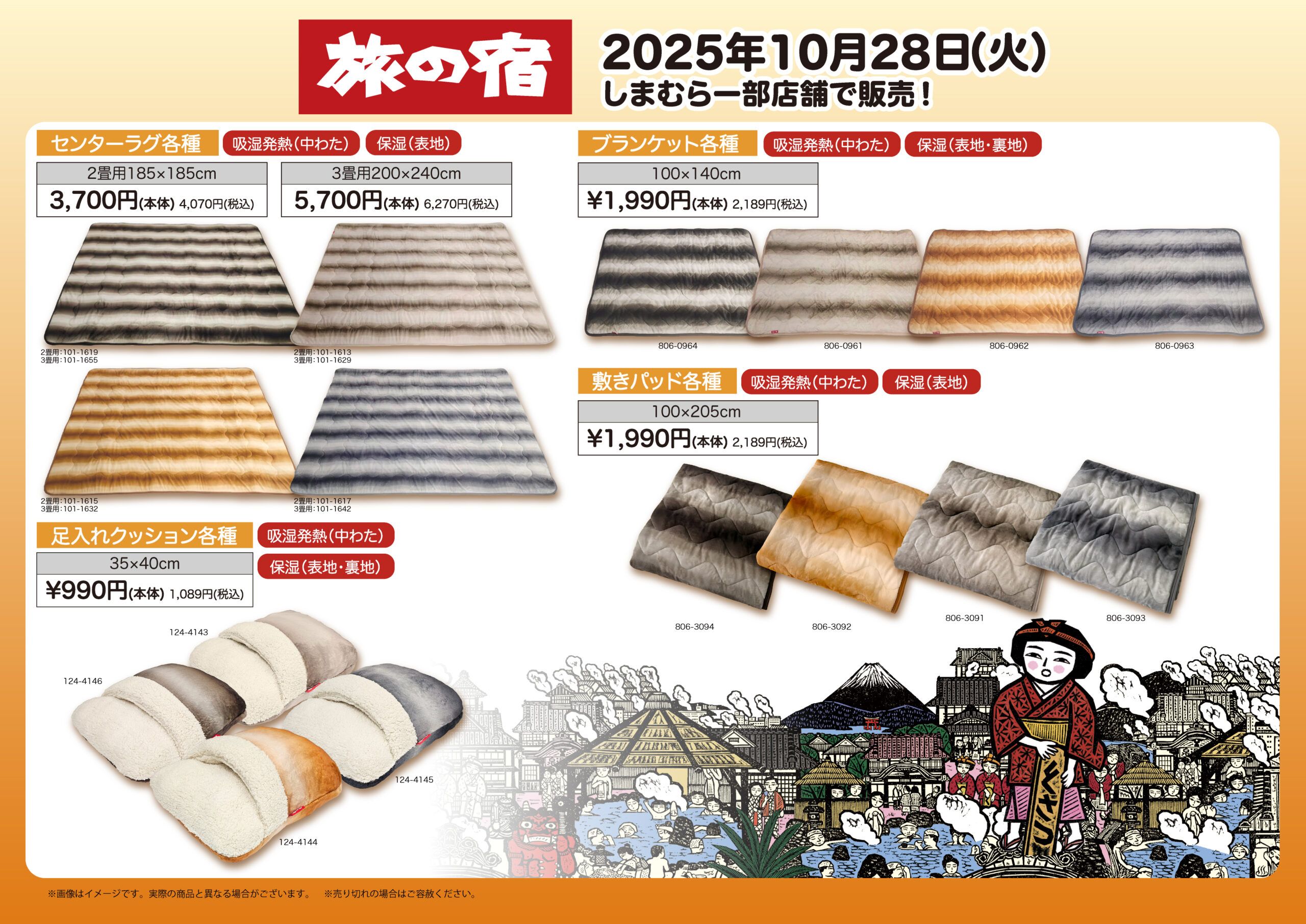 しまむら『旅の宿』コラボを2025年10月28日(火)~販売します。ブランケット、ラグ、敷きパッド、クッションがラインナップ!
