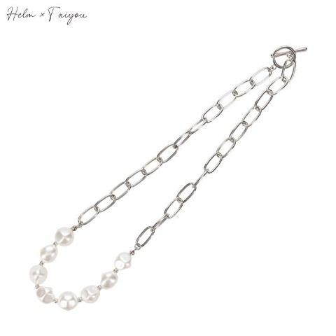 ボールチェーンとパールモチーフのチェーンを結び留めたデザインが