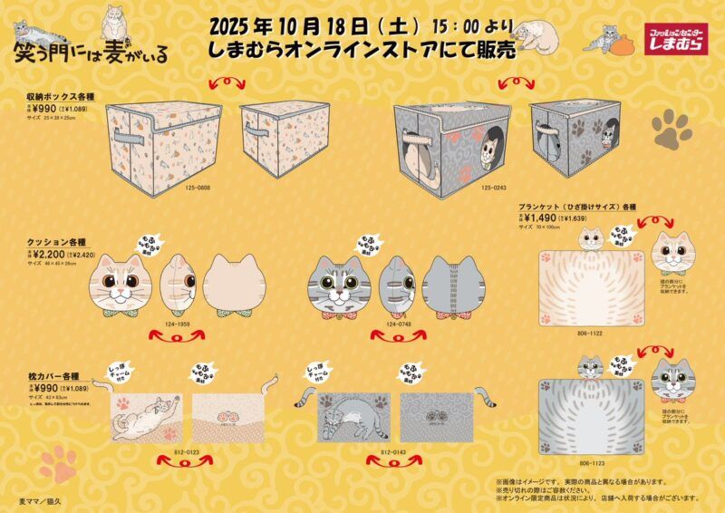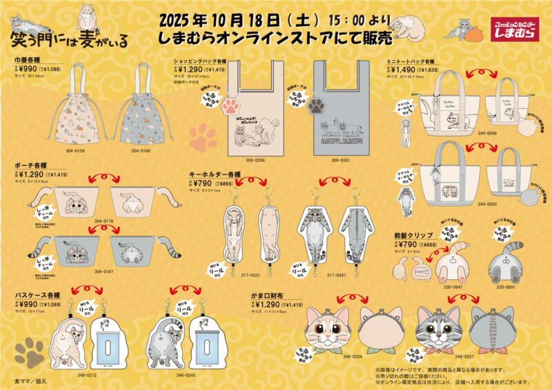 しまむら『笑う門には麦がいる』コラボを2025年10月18日(土)~販売します。巾着、バッグ、ポーチ、パスケース、財布、前髪クリップ、寝具、収納ボックス、クッションがラインナップ!
