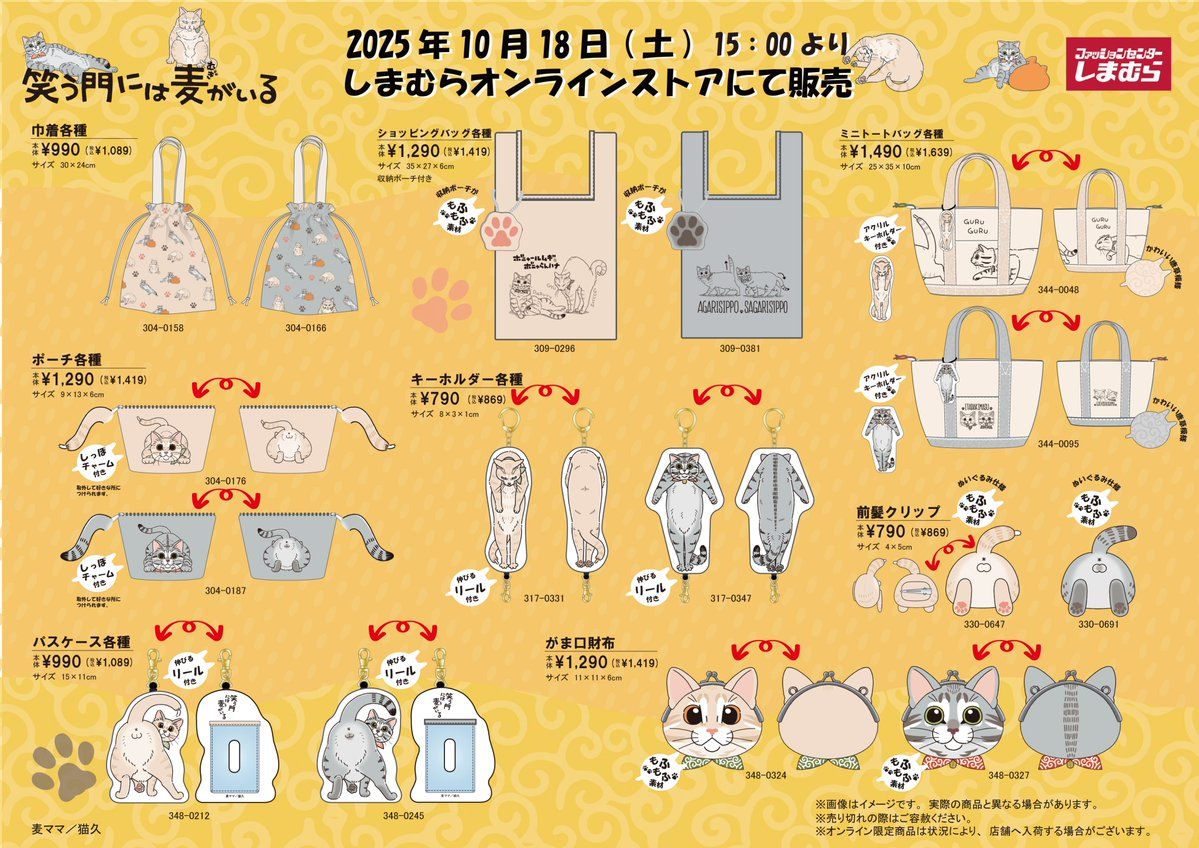 しまむら『笑う門には麦がいる』コラボを2025年10月18日(土)~販売します。巾着、バッグ、ポーチ、パスケース、財布、前髪クリップ、寝具、収納ボックス、クッションがラインナップ!