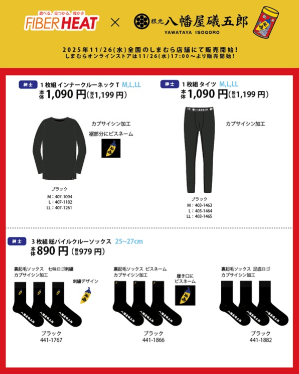 しまむら『八幡屋礒五郎』コラボを2025年11月26日(水)~販売します。FIBERHEAT(ファイバーヒート)のインナー、タイツ、ソックスがラインナップ!