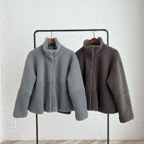 もこもこボアの立ち襟ブルゾン。寒い冬の日も暖かく可愛く着こなせます。中心から上下と、袖の上下のボアの大きさを変え、配色のようにも見えるデザインです。またAラインになっており、ざっくりとしたなかにもすっきりとした印象のブルゾンです。