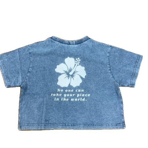 ハイビスカスのプリントがかわいいインディゴ染めのTシャツです。