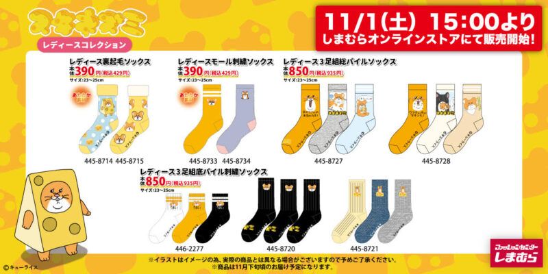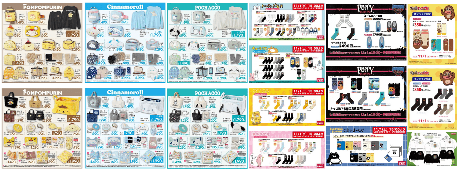 しまむらでは、2025年11月1日(土)~お文具といっしょ、サンリオ(犬の日)、キューライス、ポピープレイタイム、エブサン、サク山チョコ次郎などのコラボを販売します!