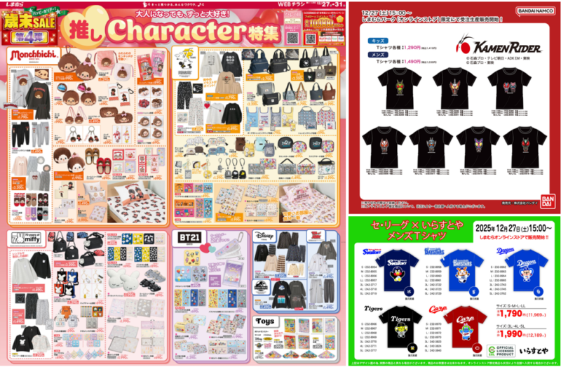 しまむらでは、2025年12月27日(土)~モンチッチ、スヌーピー、ミッフィー、BT21、仮面ライダー、いらすとやなどのコラボを販売します!