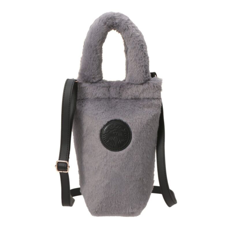 取り外し可能なショルダーストラップが付いた、ファー素材を用いたボトルショルダーバッグです。スマートフォンなど小物の収納にも便利な内ポケット付き。色違いでグレーもございます。