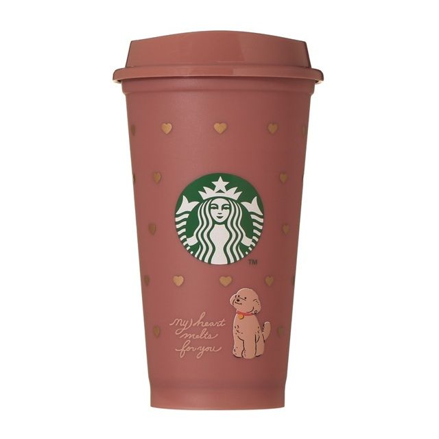 リッドにロック機能がある、スターバックスらしいカップ形状のステンレスボトルです。ボタンを右にスライドさせ、押し込むことでフタが開きます。まるでチョコレートが溶けているようなユニークなデザインです。前面にはメッセージ、背面のカスタマイズボックスはバレンタインらしいハート型と犬が可愛らしく描かれています。真空二重構造ステンレスで保温・保冷性に優れています。(漏れ防止:あり)