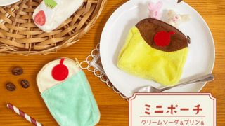 セリア セリア!レトロ喫茶風の『ミニポーチ クリームソーダ&プリン&フルーツサンド』が新発売!ミニサイズのぬいやフィギュアの持ち運びに!JANコード!