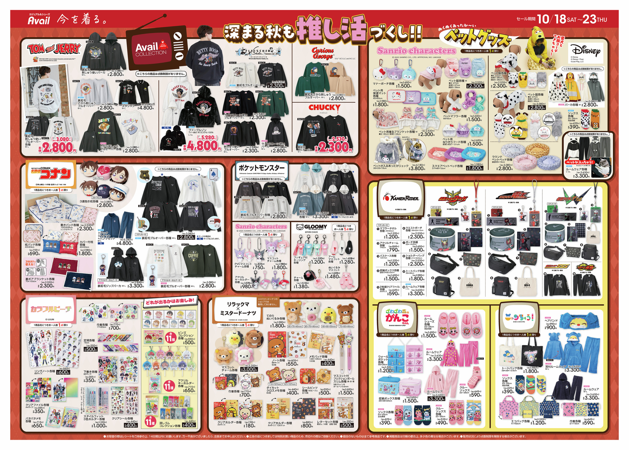 アベイル アベイル チラシ速報2025年10月18日~ポケモン、トムとジェリー、ベティちゃん、おさるのジョージ、チャッキーのトレーナーやパーカ!名探偵コナン、からぴち、リラックマ×ミスド、仮面ライダー、がんこちゃん、ニャンちゅうも新発売!サンリオ、ディズニーのペットグッズも! しまむら系列アベイルでは毎週「土曜日」に最新チラシを発行します。目玉商品も充実していて、人気のグッズは発売後即売り切れに・・・続きを読む 2025.10.17 アベイル