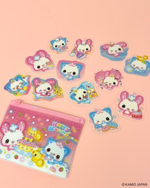 『ハッピーマーチ』は、やさしいタッチで描かれたうさぎさんとねこさんが平成ファンシーを思い起こさせる、どこか懐かしくあたたかいデザインが特徴です。