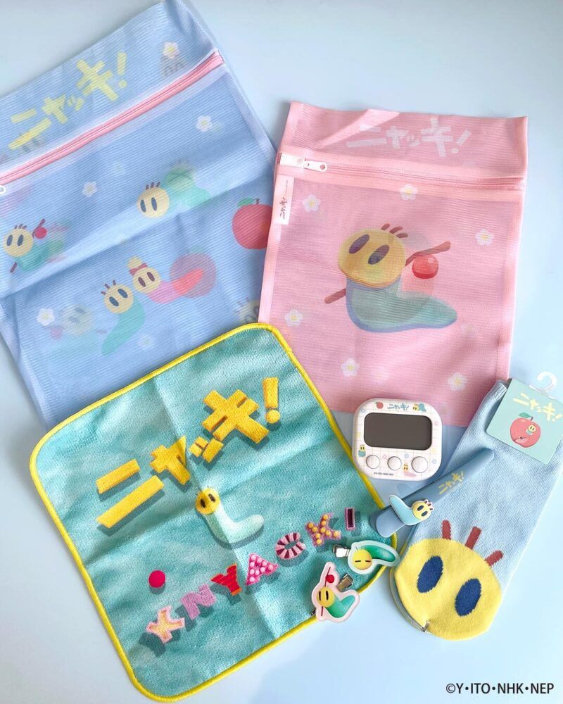 主人公であるミントグリーンの小さなイモ虫「ニャッキ」と友達の「ピンクちゃん」の左右柄違いソックスや、「ニャッキ」が大好きなリンゴモチーフのふわふわ巾着、ぬいぐるみキーホルダーなどが登場します。