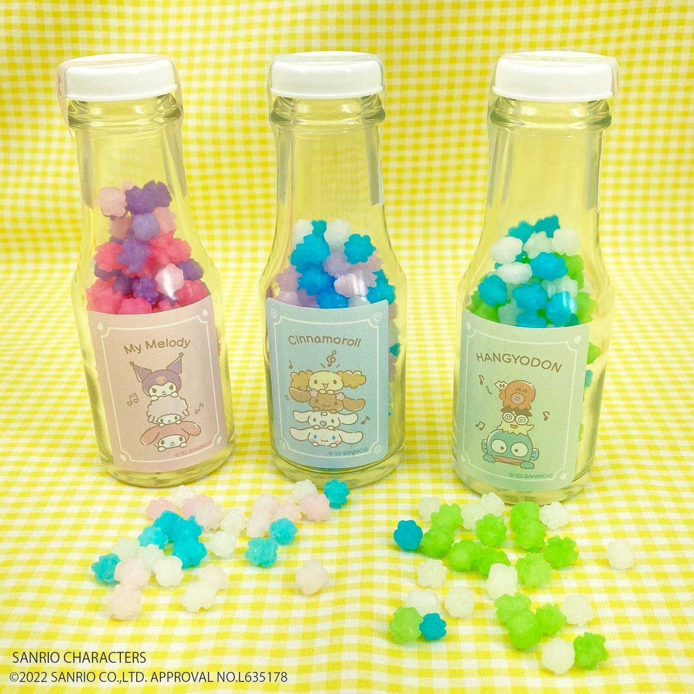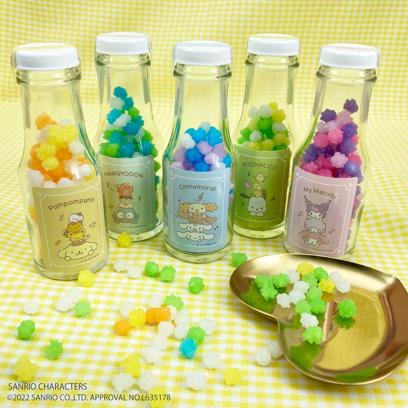 「金平糖」はレトロかわいい瓶入りで展開します。パッケージのデザインには人気の『マイメロディ』『ハンギョドン』『ポチャッコ』『シナモロール』『ポムポムプリン』とお友達キャラがたてに重なったキュートなデザインを採用しました。宝石のようにキラキラと輝く金平糖のほんのりとした甘さに癒されます。