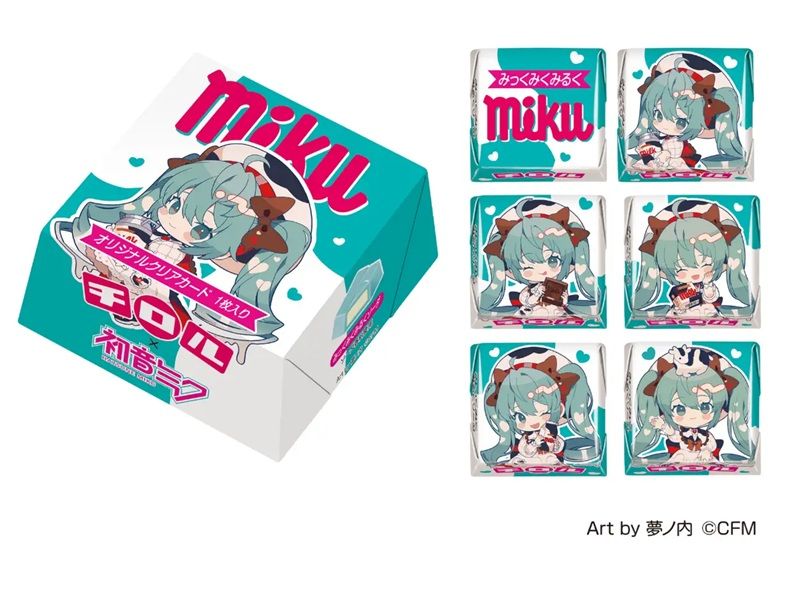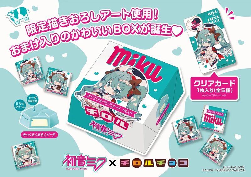 第2弾フレーバーはさわやかなソーダ風味のみっくみくみるくソーダ味です。商品パッケージにはイラストレーター・夢ノ内氏がチロルチョコのミルク味をテーマに描きおろした甘くとろけるキュートな初音ミク(チロルミク)が登場!BOXタイプでかわいいおまけのクリアカード1枚付きです。
