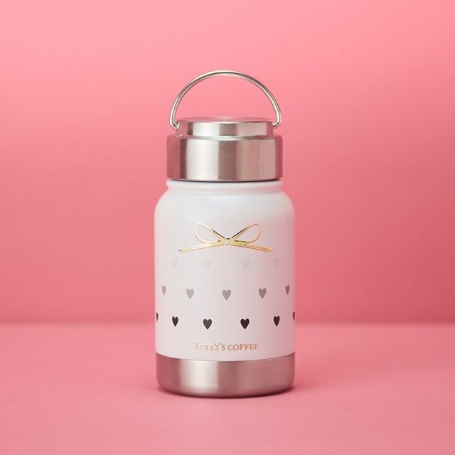 持ち運びにも便利なハンドル付のステンレスボトル。ぷっくりとした3Dプリントで施されたハートとリボンが大人かわいいデザインです。