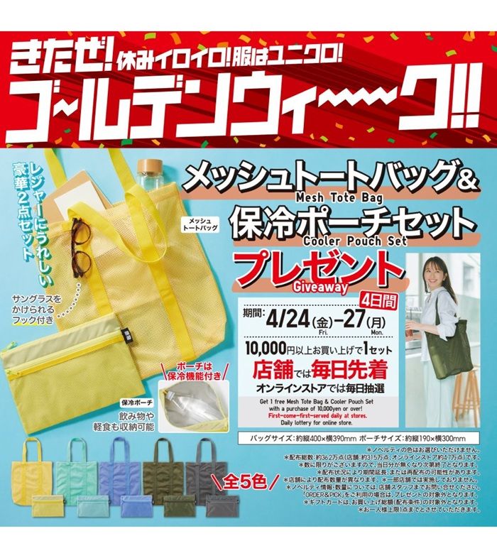 対象期間中に、10,000円(税込)以上ご購入のお客様へ「メッシュトートバッグ&保冷ポーチセット」を1点プレゼントされます!GWのお出かけにも、普段使いにも嬉しい豪華2点セット!