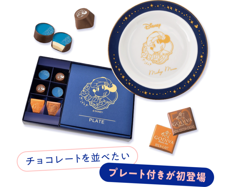 「GODIVA(ゴディバ)」との共同制作のバレンタインチョコレート。2026年のディズニーストアバレンタインは、イニシャル入りエプロンのオリジナル衣装を着こなすショコラティエミッキーが登場♪ ショコラティエミッキーが手がけるチョコレートは、どこにも負けない至福の味わい。リッチなブルーを基調に、差し色として上品なゴールドをあしらった今年のパッケージデザインは、特別な日にふさわしい最高の逸品。ディズニーストア初となるオリジナルチョコレートも2種もお目見え。