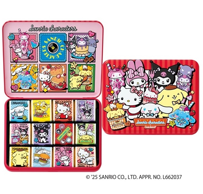 周年デザインの缶に、マイメロディ・クロミの歴代人気デザインの薄板チョコレートを詰合せた、ファン必見の一品。12個入。
