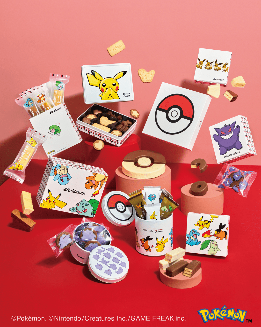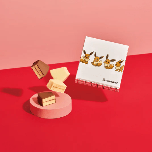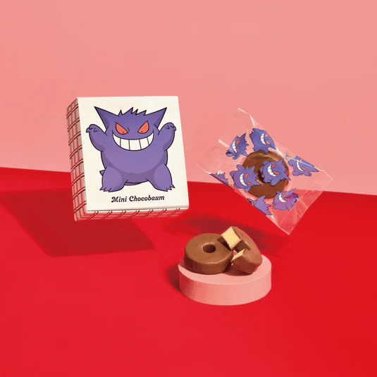 ていねいに焼きあげたバウムクーヘンを、食べやすいスティック状にカットしました。個包装のデザインはピカチュウ、メタモン、イーブイ、カビゴンの全4種類(ランダム封入)。