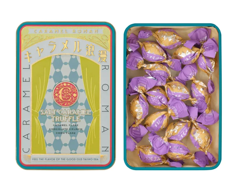 カカオが香るようにじっくりと丁寧に煮詰めたキャラメルは、チョコレイトとキャラメル両方の美味しさを楽しめます。缶の蓋にはエンボス加工が施され、キャラメルを食べてうっとりする令嬢の様子が描かれています。