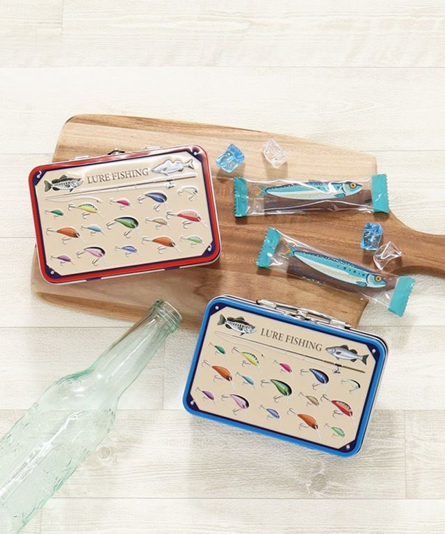釣り好きさんにはたまらない、様々なルアーがデザインされた持ち手付きケースのお菓子缶。