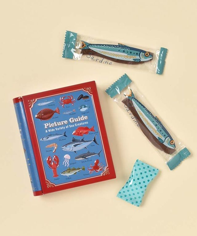 ケースの缶の留め具を開けると、魚のイラストがデザインされたチョコレート、ラムネが入っています。