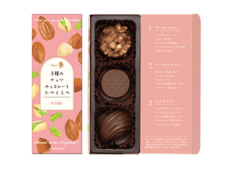 ヘーゼルナッツ&アーモンド、キャラメルアーモンド、ピスタチオの3種のナッツチョコレートたべくらべ。