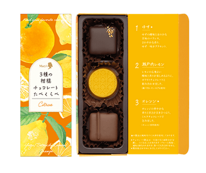 さわやかな酸味で気分もリフレッシュ、ゆず、シトロンキャラメル、オレンジの3種の柑橘チョコレートたべくらべ。