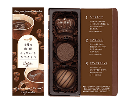 ヘーゼルラテ、エスプレッソ、カフェオレトリュフの3種のコーヒーチョコレートたべくらべ。