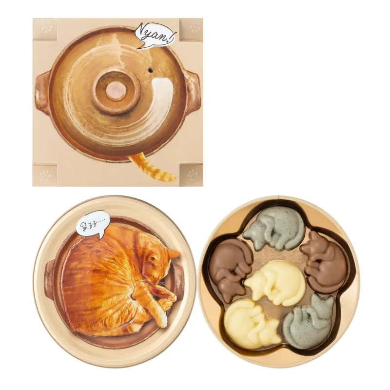 丸まってお昼寝している白猫と黒猫や、肉球などをモチーフにした、心踊るかわいらしいチョコレートがいっぱいのアソートボックス。