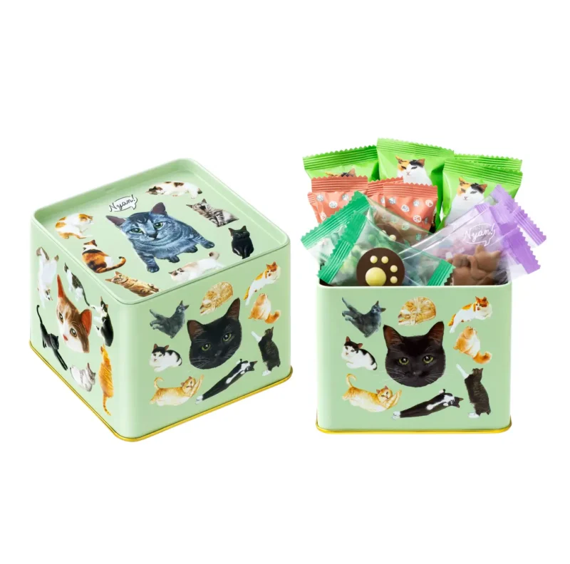 どこを見ても猫でいっぱいの、まさに「ねこみゃみれ」なアソート缶。全面にエンボスをあしらい、立体感のある猫たちの様子がたまらない缶の中には、猫の形のチョコレートやクランチチョコレートなどを入れました。