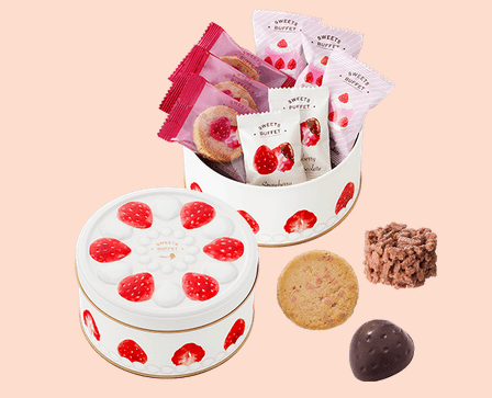 4種類の食感の異なるチョコレートといちごのハーモニーをお楽しみいただけるアソート缶です。