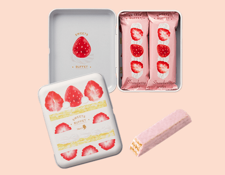 3種類のキュートないちごのチョコレートといちご味のチョコレートでコーティングしたウエハースを、ショートケーキデザインのマルチケースに詰め合わせました。