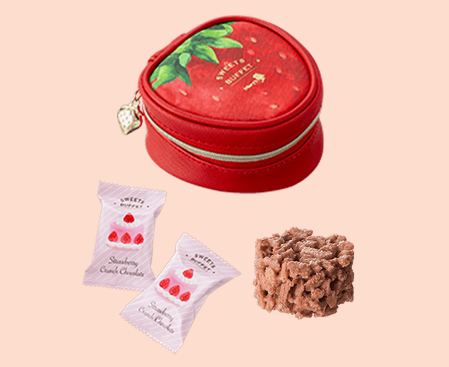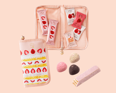 3 種類のキュートないちごのチョコレートをショートケーキデザインのポーチに詰め合わせました。