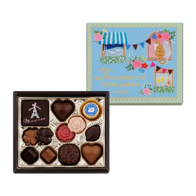 可愛い猫やティーカップが描かれたイラストパッケージに、バラやハートなど、様々な形のチョコレートを詰め合わせました。