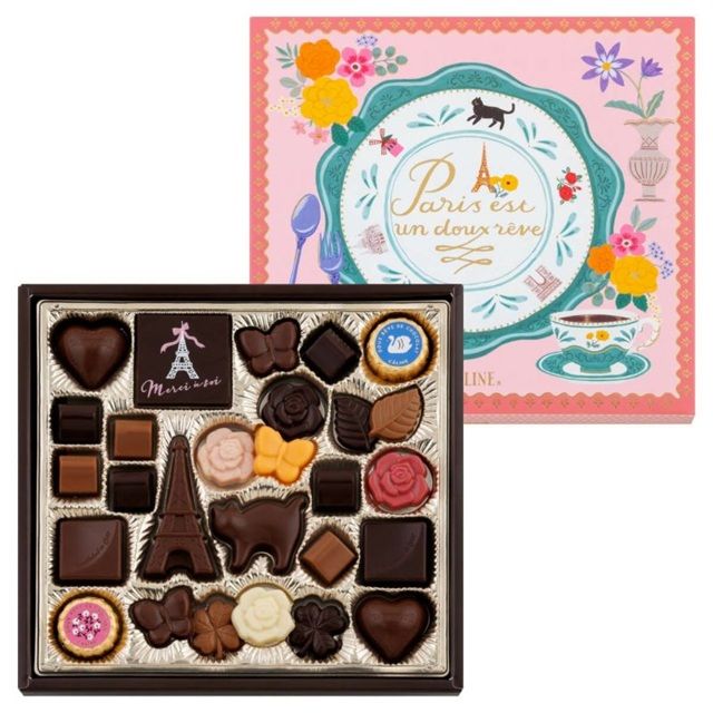 パリをイメージしたエッフェル塔や可愛らしい猫、クローバやバラなどキュートな形のチョコレートを詰め合わせました。